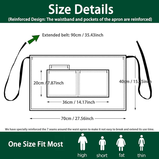 - Extended Waist Ties - The waitress apron back strap extended to 90cm (35.43 inch), long waist ties can be easily altered to fit most sizes, suitable for both men and women