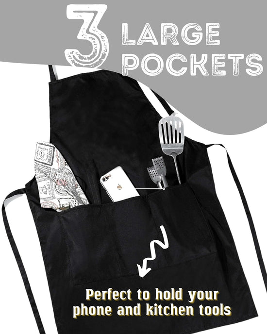 - User Friendly - Our aprons feature three big, deep pockets in front, which are perfect for holding your cellphone, pens, notebook, grill accessories, and other important items. Convenient for you to store any gadgets.