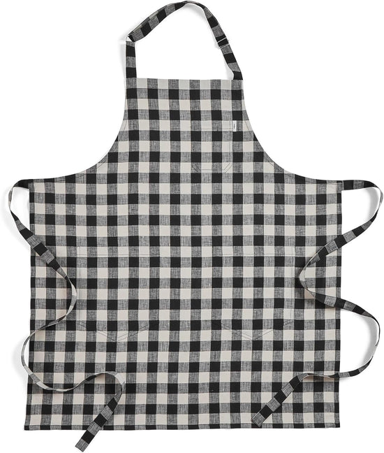 Solino Home Linen Bib Apron for Men & Women - Black and Cream Kitchen Apron with Front Pockets - Handcrafted from European Flax
